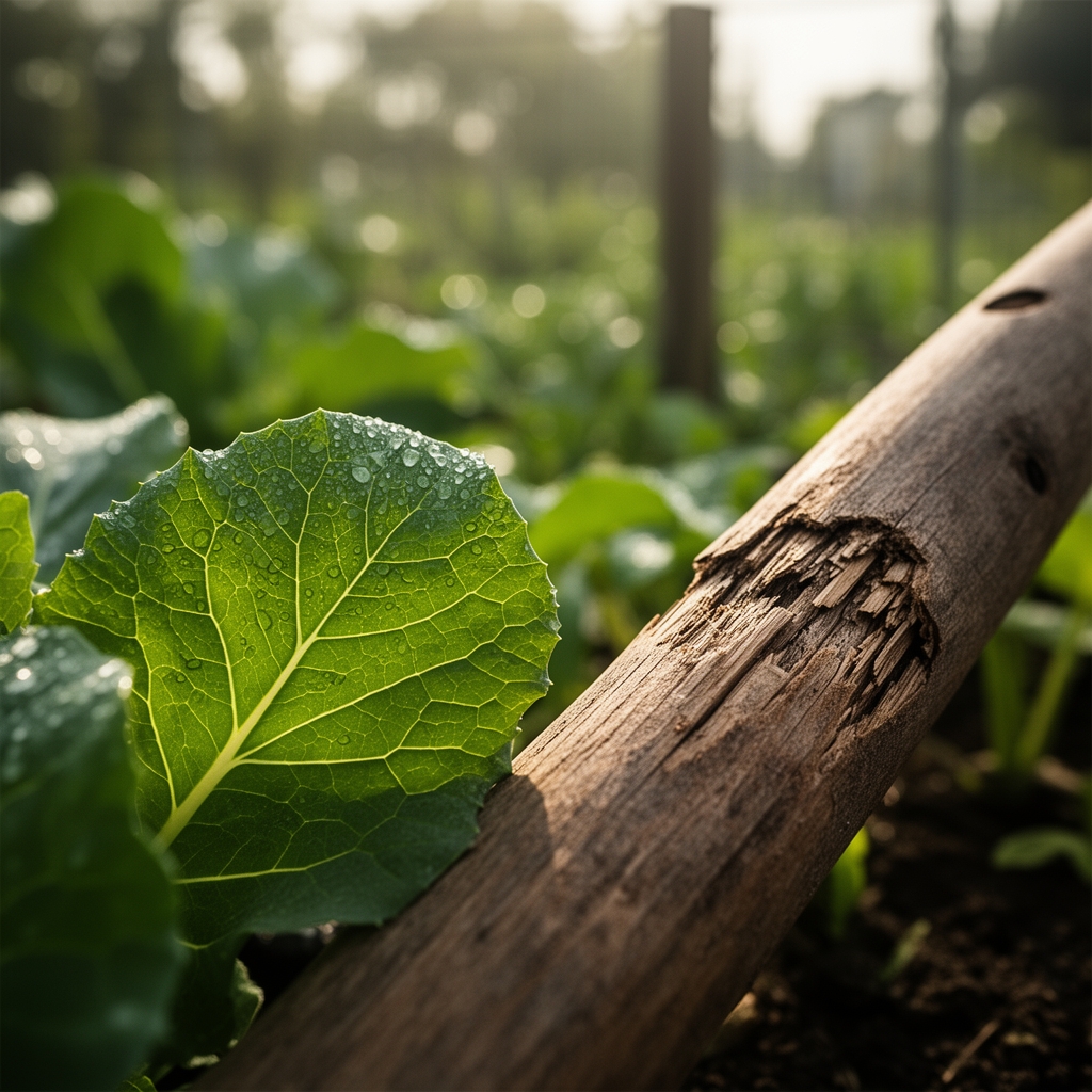 Solution: Copper toxicity from pressure-treated lumber. Transplant affected crops 18 inches farther from posts and amend soil with 2 inches of compost to bind excess copper ions.